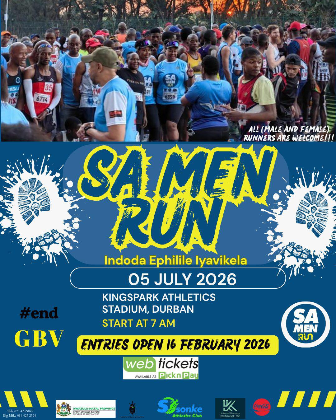 SA MEN RUN: 05 July 2026 10km and 5km run/walk Entries open 16 February 2026 Run with purpose. Stand up as men. Tag a buddy you’re running with & don’t miss entries! Indoda Ephilile Iyavikela